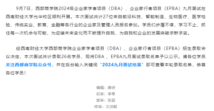 恭喜录取!啪啪啦 2024级企业家学者项目(DBA)、企业家行者项目(EPBA)九月面试圆满结束