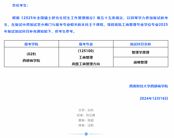 关于工商管理专业2025年硕士研究生招生同等学力加试科目的补充通知