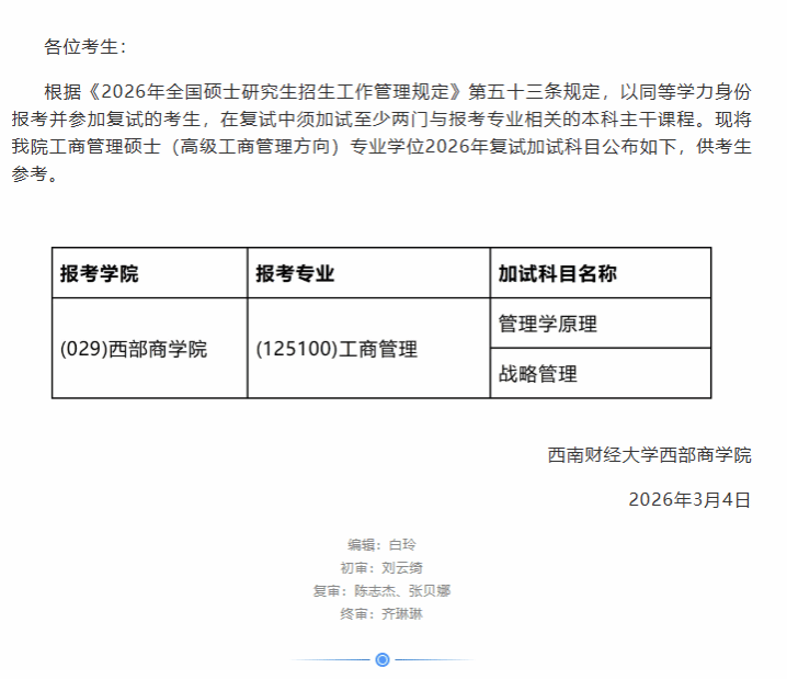 关于2026年工商管理硕士(高级工商管理方向)研究生招生同等学力加试科目的通知