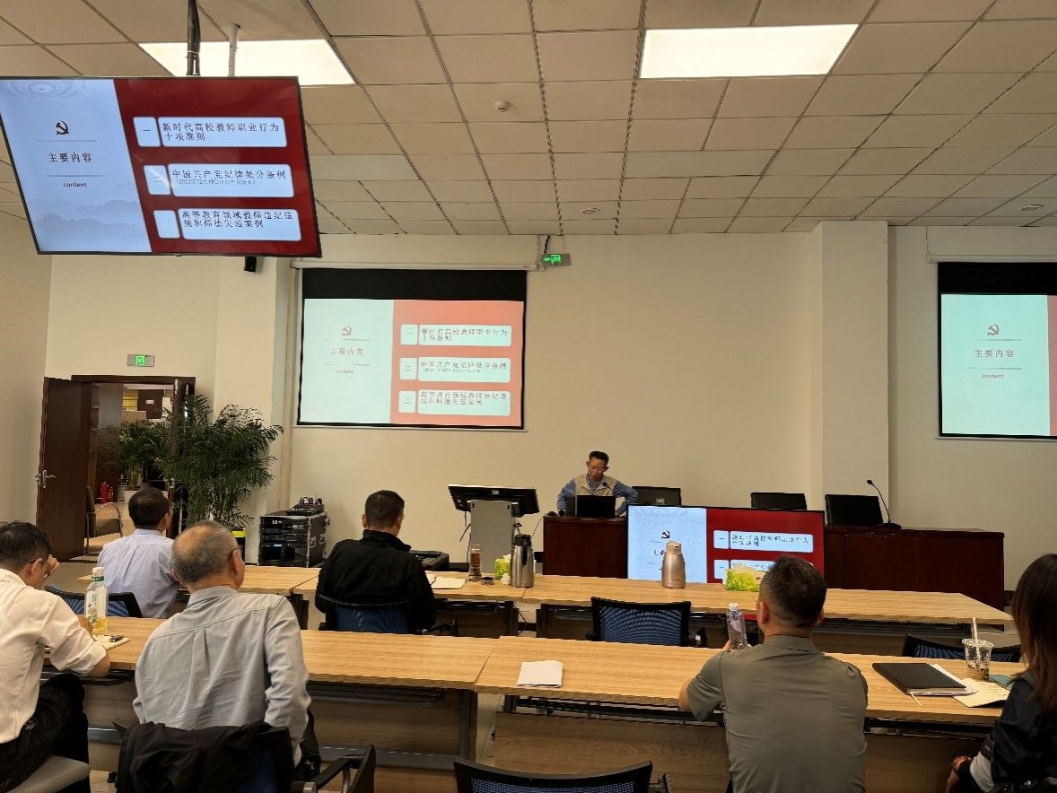 文洪毅传达学习了习近平总书记在二十届中央纪委三次全会上的重要讲话精神和学校2024年全面从严治党工作会议精神,并就学院党总支关于开展党纪学习教育的工作计划向大家进行了介绍和说明。会议强调,全体党员、教职工要深学细悟习近平总书记关于党的自我革命的重要思想,更好地理解全面从严治党的深刻含义,广大党员尤其是党员领导干部要学纪明纪,增强纪律意识,严于律己、严负所责、严管所辖,守住纪律底线。文洪毅还为大家开展了师德师风专题学习暨警示教育。他首先带领大家重温了《新时代高校教师职业行为十项准则》,强调作为高校教师,要严守底线、学为人师,行为世范。随后,他为大家进行了《中国共产党纪律处分条例》(以下简称《条例》)导学,着重讲解了2023年12月8日中共中央政治局会议第三次修订的主要内容,指出党中央时隔5年再次修订《中国共产党纪律处分条例》,就是要贯彻落实党的二十大战略部署,不断完善纪律规矩,始终坚持严的基调,释放从严治党越来越严、越往后执纪越严的强烈信号。最后,他结合《高等教育领域教师违纪违规和师德失范案例(2024年第1期 总第18期)》整理的案例为大家进行了典型案例警示教育,再次提醒大家严格遵守高校教师职业行为“红线”,强调以案为鉴、警钟长鸣。